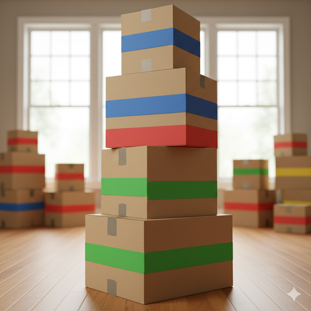 Fini les « où est le carton de la vaisselle ?! » Le code couleur est votre meilleur allié pour un déballage rapide et sans frustration.